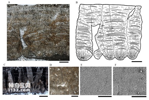 图2 金国微椭圆蛋(Parvoblongoolithus jinguoensis oogen. et oosp. nov.)蛋壳显微结构,A, B, E, F, 比例尺=0.2 mm; C, D, 比例尺=0.4 mm。