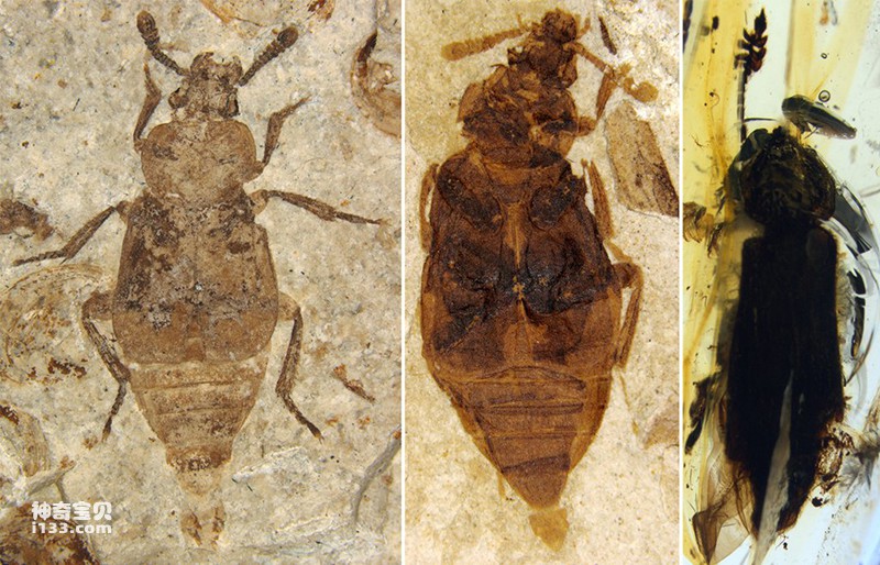 左图:中侏罗世道虎沟生物群的葬甲(距今1.65亿年);中图:早白垩世热河昆虫群的葬甲(1.25亿年);右图:晚白垩世早期缅甸琥珀中的葬甲(0.99亿年)
