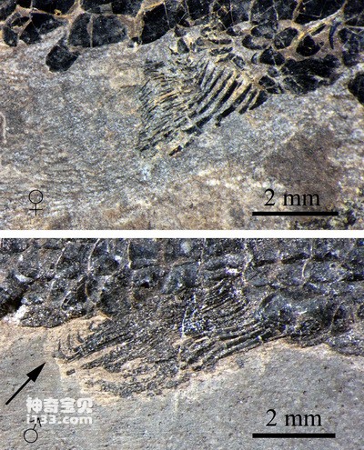 图3:精美乌沙鱼的雌雄和雄性臀鳍对比,箭头指示雄性臀鳍上的钩子