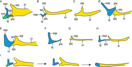 图2方颧骨、颧骨形态在恐龙——鸟类中的演化