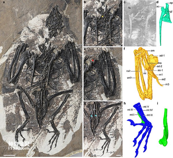 中生代记录了鸟类如何从恐龙演化出来,并演化出独有的体型特征。这一演化阶段鸟类谱系的多样性主要以反鸟类和今鸟型类构成的鸟胸类为主,而鸟胸类已经演化出大量与现生鸟类相似的形态特征,与最原始的鸟类(始祖鸟)在形态上差异巨大。演化位置介于二者之间的非鸟胸类鸟类(以下简称基干鸟类)则为填补这一鸿沟提供了重要信息。但是长期以来受限于化石发现,限制了对基干鸟类早期分异的研究。此次发现的鸟类恰好属于热河生物群(距今1.35—1.2亿年)基干鸟类巾帼鸟科(Jinguofortisidae)的新属种(图1),研究人员将其命名为朱氏克拉通鸷(Cratonavis zhui):鸷,意指凶猛的鸟,取自屈原的《离骚》——鸷鸟之不群兮,自前世而固然;属名克拉通,取自国家自然科学基金基础科学中心项目“克拉通破坏与陆地生物演化”(这是探讨生物演化和华北克拉通破坏内在联系的大型学科交叉项目)。种名献给朱日祥院士,其团队在华北克拉通破坏的机理问题方面开展了大量重要研究。