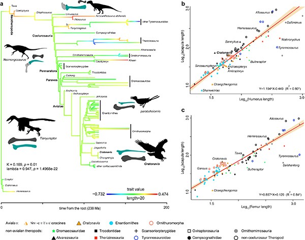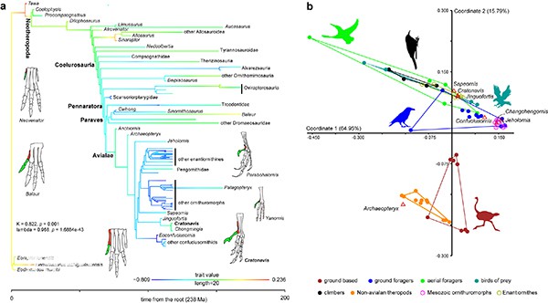 克拉通鸷最为特殊的是具有异常长的肩胛骨和第一蹠骨(相当于脚掌最内侧的骨骼)。研究人员通过比较分支系统学的方法,追溯了上述两块骨骼在恐龙—鸟类演化过程中的动态轨迹(图2)。肩胛骨是鸟类飞行结构的重要组成部分,其形态在不同飞行方式的鸟类中变化显著。研究人员发现肩胛骨在兽脚类恐龙比在鸟类中更易发生长度的改变,其在克拉通鸷中的独立加长有可能是适应飞行的一种尝试,因为加长的肩胛骨能够扩大控制向下扇动翅膀的肌肉的附着面积。克拉通鸷的第一蹠骨的相对长度远超过其他鸟类和多数恐龙。在恐龙—鸟类演化中,第一蹠骨显示出缩短的趋势,例如第一蹠骨在鸟类中的相对长度比例是远小于原始的兽脚类恐龙,而鸟类第一蹠骨的比例在其分异伊始就已经确立。第一蹠骨在克拉通鸷中的加长是独立演化的结果。这一结论也可以从第一蹠骨的系统发育信号的变化中得到证实:其受系统发育关系影响的程度在兽脚类恐龙中较高,但是在接近副鸟类时降低(图3)。利用生态主轴分析,结合巨大的第一脚趾和弯曲的脚爪,研究人员提出第一蹠骨的异常增长有可能与克拉通鸷类似猛禽一样的生态习性有关。克拉通鸷独特的肩胛骨和蹠骨显示了在个体发育、自然选择和生态功能机会的动态作用下,一些看似演化相对保守的骨骼“摆脱了限制”而发生演化变化的现象。