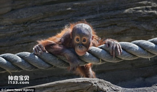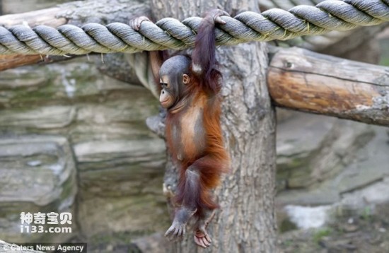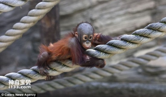 在俄罗斯莫斯科动物园,一只刚出生不久的小猩猩在看到父母熟练地在圈地内的绳子上攀爬行走后,决定鼓起勇气独自来尝试一下。尽管这只出生不久的小猩猩在开始的时候看上去有些紧张,但很快它就找到了感觉,适应了在绳上的行走。