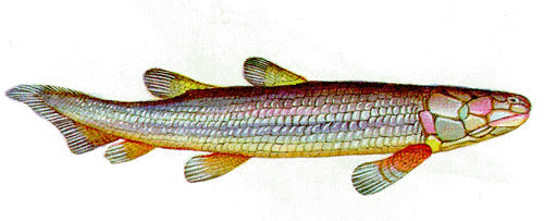总鳍鱼类的最早代表是泥盆纪中期的骨鳞鱼。从它身上,实际上已经可以多多少少地看出一些早期两栖类动物的“苗头”了。