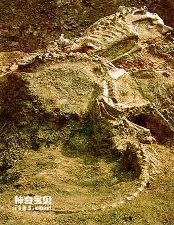发掘队跟随着报信的人来到木杆榔村,那里果然有一串恐龙的脊椎骨出露在一个小冲沟里。他们决定在这里进行发掘。几天后,一个触目惊心的场景出现了。原来这里竟然有两条恐龙!而且,是两条完整的恐龙骨架扭在一起,其中一条是古脚类恐龙,而另一条却是食肉的双嵴龙,后者的大嘴正好咬在前者的尾椎骨上。科学家根据化石的这种埋藏状况推测,这两条恐龙的死因可能有两种:一是它们在一场你死我活的搏斗中两败俱伤而双双死去;再一种可能就是古脚类恐龙已经死去多日,尸体上的肉已经腐败变质了,而饥肠辘辘的兽脚类只管填饱肚子,没想到却因吃了腐败变质的古脚类恐龙肉而中毒身死。从二者平静的姿势来看,后一种可能性甚至更大些。
