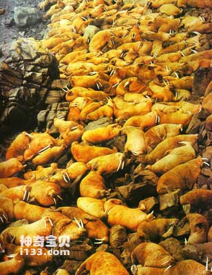 海象,顾名思义,即海中的大象,它身体庞大,皮厚而多皱,有稀疏的坚硬的体毛,眼小,视力欠佳,体长3~4米,重达1300公斤左右,长着两枚长长的牙。与陆地上肥头大耳、长长的鼻子、四肢粗壮的大象不同的是,它的四肢因适应水中生活已退化,不能像大象那样步行于陆上,仅靠后鳍脚朝前弯曲,以及獠牙刺入冰中的共同作用,才能在冰上匍匐前进。海象主要生活于北极海域,也可称得上北极特产动物,但它可作短途旅行。所以在太平洋、大西洋都有其踪影。