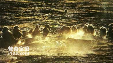 麝牛在分类上是一种介于牛和羊之间的动物,也许将其归于羊科或羚羊科更为合适。从其外表来看,更像我国西藏的牦牛,而且也确实有一股牛脾气。麝牛高约1米半,长约两米到两米半左右,体重可达400多公斤,雌牛略轻,大约只有雄牛的3/4。其重量主要集中于长有肉峰的前半身,前重后轻,显得格外矫健有力,是北极最大的食草动物,分布于加拿大、格陵兰和阿拉斯加北部的冰原上,以苔藓、地衣和植物的根、茎及树皮等为食,行动迟缓,劲头十足,俨然是苔原上的主宰。