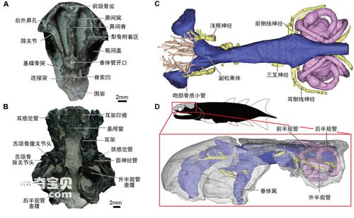 目前只发现了箐门齿鱼的头部骨骼。4.1亿年前当它活着时候,全长大概有15cm,齿旋等爪齿鱼类的标志特征表明它虽然躯体较小,但也是一种凶猛的掠食者。更令人兴奋的是,它保存了脑腔、内耳、神经和血管通路等一整套在澳大利亚的爪齿鱼类化石中缺失的重要脑颅形态信息,这就为研究爪齿鱼类乃至整个肉鳍鱼类早期演化历史补上了重要的一个证据。