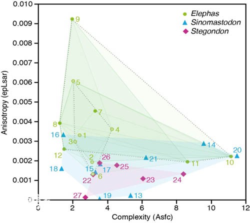 使用DMTA研究方法探讨古哺乳动物及古人类的食性已成为近年来古生物学研究的热门方向。相对于利用普通光学显微镜或扫描电子显微镜研究动物牙齿化石微痕的传统方法,DMTA在数据收集过程的严谨性与可重复性方面有更显著的优势。通过比较中华乳齿象、剑齿象与亚洲象臼齿微痕的复杂性(complexity)与各向异性(anisotropy),研究人员发现华南早更新世的中华乳齿象与横跨整个更新世的剑齿象主要喜食嫩叶,这与食性较广、既食草亦食树叶的亚洲象形成了显著统计差异。