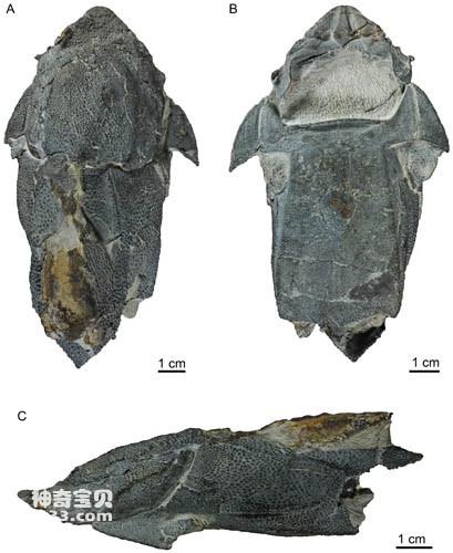图1 长吻麒麟鱼正型标本(IVPP V20732)照片,背视图(A),腹视图(B),侧视图(C)(朱敏供图)