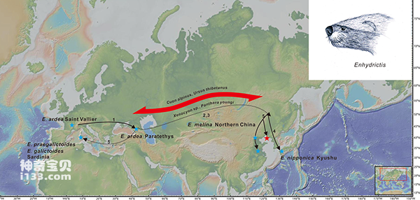 图3. 獾型海獭貂迁徙路径,复原图和中更新世转型期生物交换示意图(江左其杲 供图)