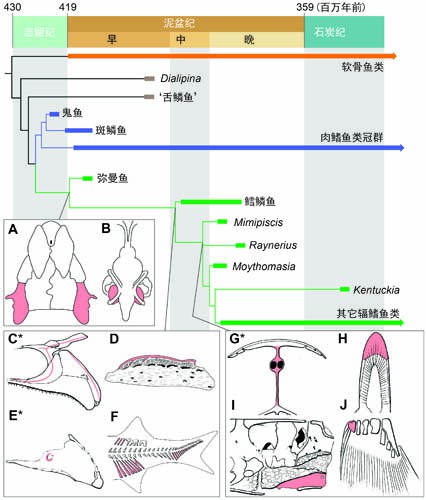 然而,辐鳍鱼类在这一时期留下的化石却极其稀少。过去对最早期辐鳍鱼类的认识主要来自3.9-3.8亿年前的鳕鳞鱼化石,这是一种长可超过半米,体型流线,长着大的口裂和锋利牙齿的掠食者。它在欧洲和北美都留下数量众多,保存完好的化石材料。可是,鳕鳞鱼已经拥有了辐鳍鱼类的绝大多数典型特征,跟辐鳍鱼类与肉鳍鱼类的最近共同祖先相比,它们之间还存在相当大的一段缺口。在过去至今的一百多年古生物学史中,这一缺口一直是困扰学界的一个大谜团。