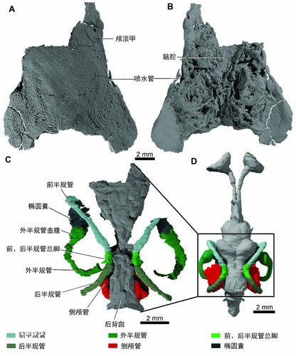 把骨片翻过来后,露出层层叠叠,像丘陵等高线般复杂而不规则的,已经石化的构造,这些构造代表了四亿年前古老鱼类的脑腔、血管、神经和内耳等精细结构的形态。利用高精度CT技术对这些结构进行的研究表明,弥曼鱼还具有好几种辐鳍鱼类才有的特征,而最关键性的证据来自它的喷水孔——人类耳道的前身。