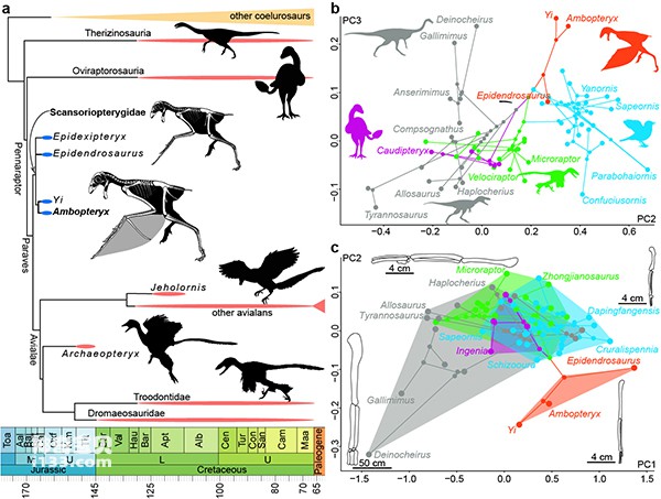 图3.中生代虚骨龙类系统树和肢骨演化:在飞行起源时,副鸟类不同类群显示出不同的前肢加长过程:善攀鸟龙类通过肱骨加长,结合第三手指和棒状长骨附着膜质翅膀;而驰龙类、伤齿龙类和鸟类则通过掌骨的加长以附着羽状翅膀(王敏供图)