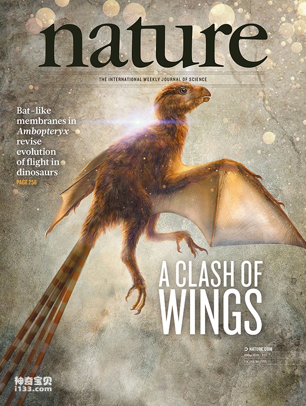 图1.《自然》当期杂志封面:古脊椎所发现侏罗纪具膜质翅膀的恐龙
