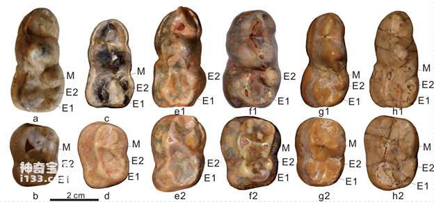 图2非洲郊熊a-f,亨氏郊熊g和印度熊h牙齿结构变异对比图。图中M代表下后尖,E1为后侧下内尖,E2为前侧下内尖(江左其杲 供图)