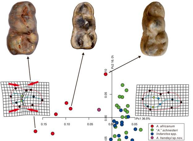 最近,中科院古脊椎所博士研究生江左其杲和美国自然历史博物馆John J. Flynn合作,在国际期刊Journal of Mammalian Evolution上描述了一件来自美国亚利桑那州Quiburis组的郊熊化石。经过详细对比,确认该标本为郊熊属一新种,即亨氏郊熊Agriotherium hendeyisp.nov.。该种个体明显小于北美同时代的“Agriotherium”schneideri,也小于大部分旧大陆的郊熊,为已知个体最小的郊熊之一。更为重要的是,这件标本的下裂齿体现出了印度熊和郊熊过渡的特征,为解决二者关系提供了绝佳的契机。通过详细回顾非洲郊熊下裂齿的变异模式,研究人员对郊熊的起源提出了新的见解。