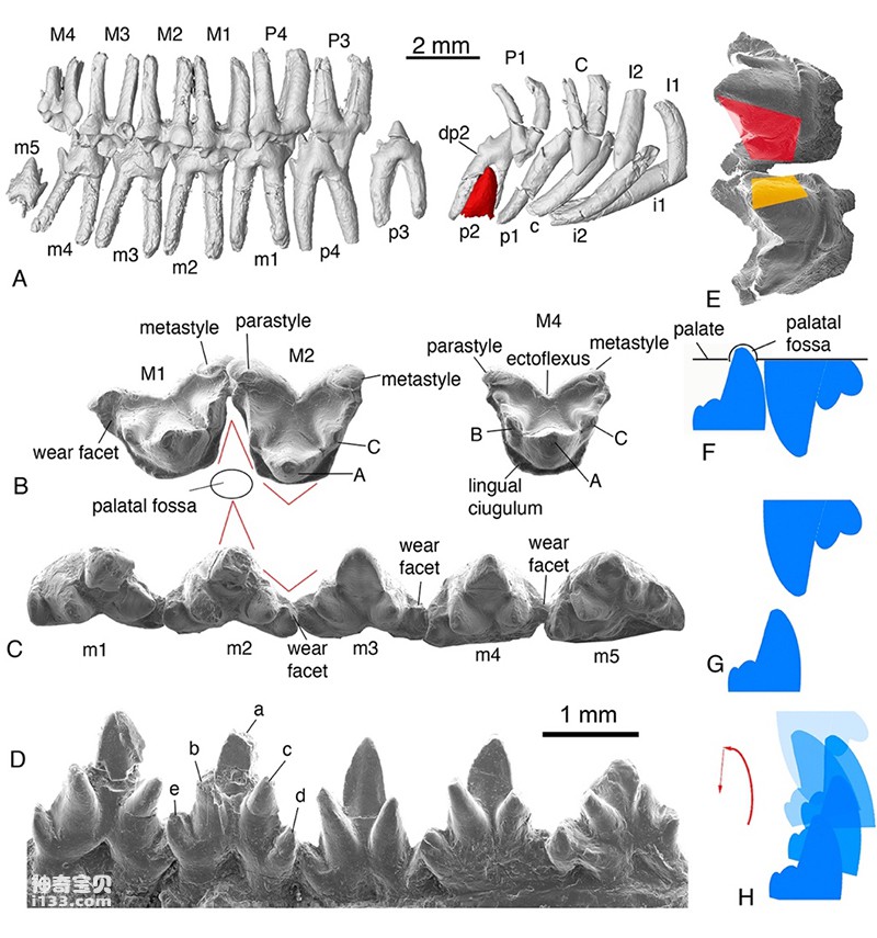 图二. 李氏源掠兽(Origolestes lii)牙齿形态、磨蚀细节和咬合运动关系 (毛方园 供图)