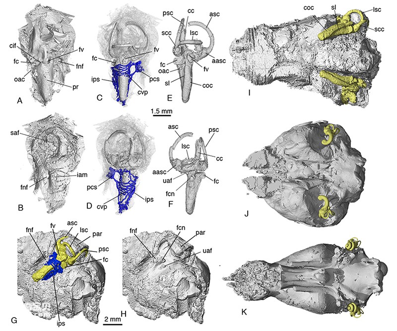 图四. 李氏源掠兽内耳结构与脑腔形态及相对关系(A-I),以及与单孔类(J)、有袋类(K)的比较。黄色为内耳结构的内模,蓝色为内耳相关血管系统 (毛方园 供图)