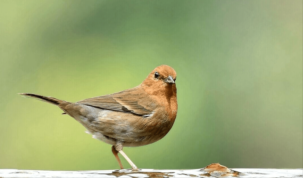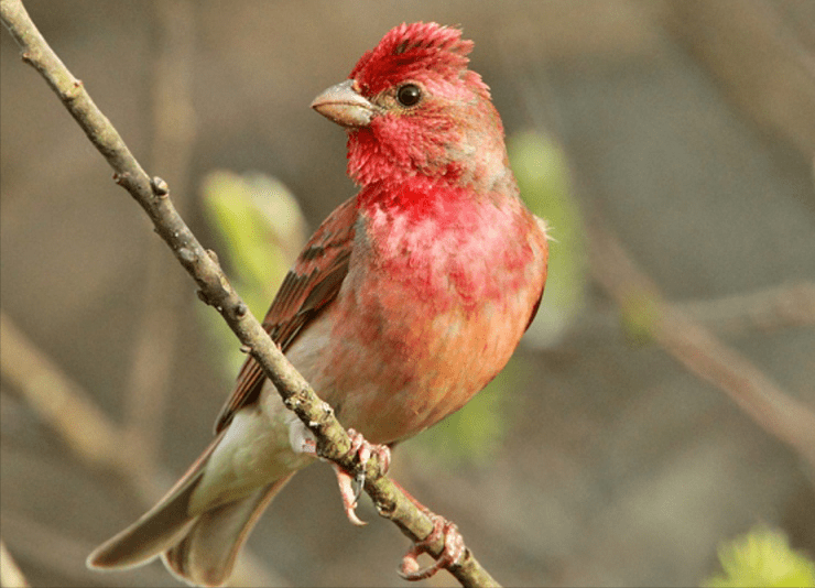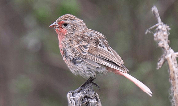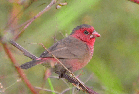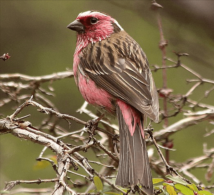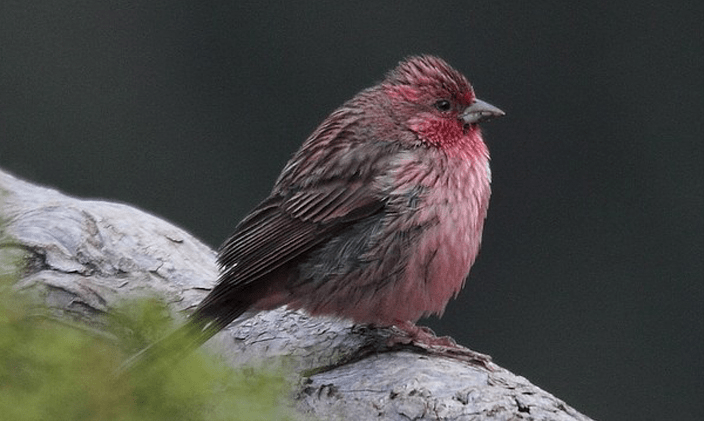 曙红朱雀甚似红眉朱雀但体型较小,嘴细而尾短,无红眉朱雀的皮黄褐色两胁。额不似玫红眉朱雀鲜艳,且额上密布纵纹,腰更为淡粉。