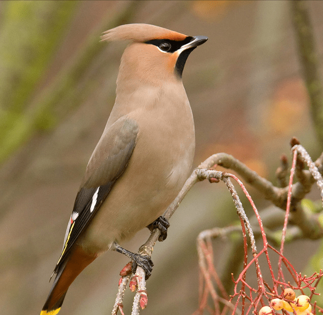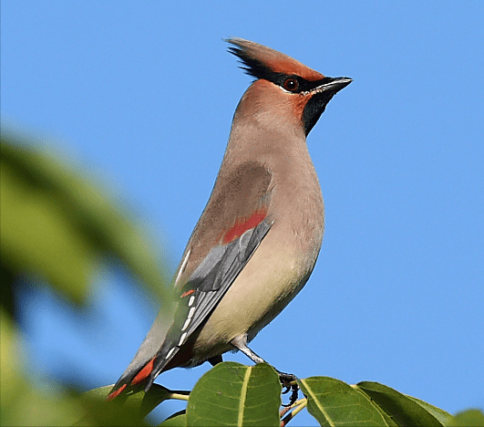 小太平鸟尾端绯红色显著,与太平鸟的区别在黑色的过眼纹绕过冠羽延伸至头后,臀绯红。俗称十二红、绯连雀、朱连雀