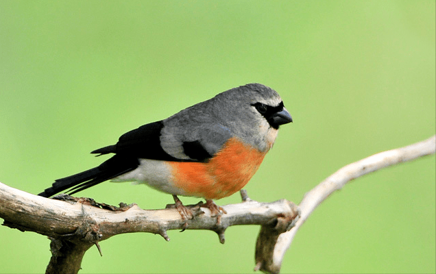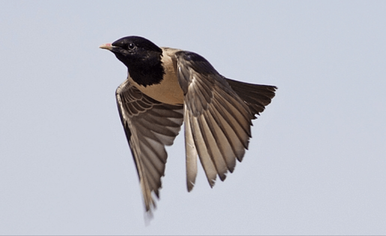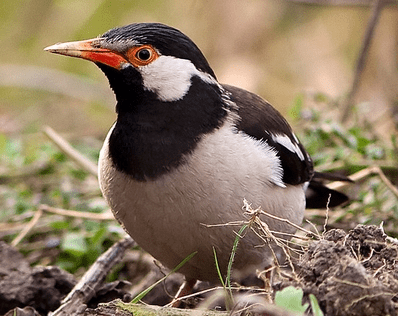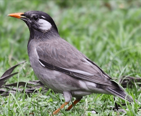 禾雀也叫做灰文鸟,粉红的嘴、脚以及头部一大块白斑背、肩、腰、翅上覆羽和内侧飞羽蓝灰色,下腰、尾上覆羽和尾羽黑色,飞羽浅褐色具窄的灰色羽缘。颏和上喉黑色,下喉、颈侧、胸和胸侧鸽灰色,腹和两胁葡萄灰色或葡萄红色,尾下覆羽白色有时微缀以葡萄色。