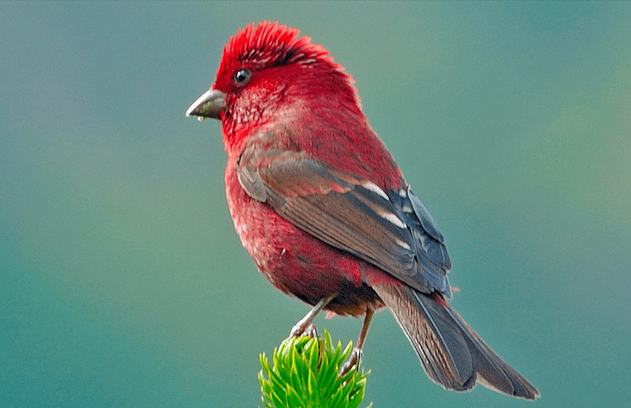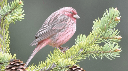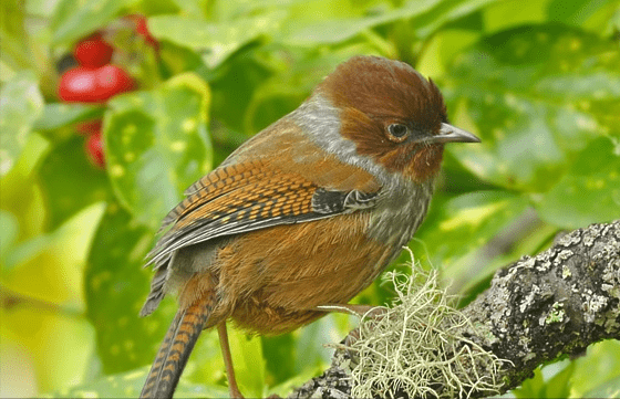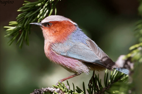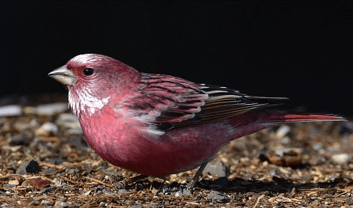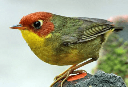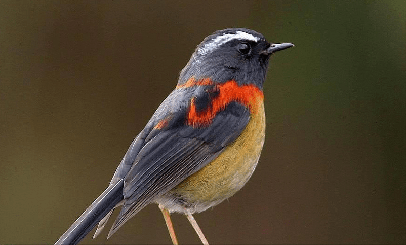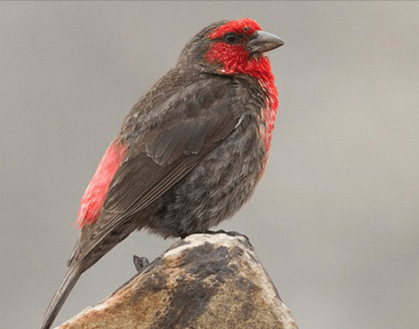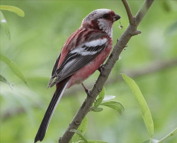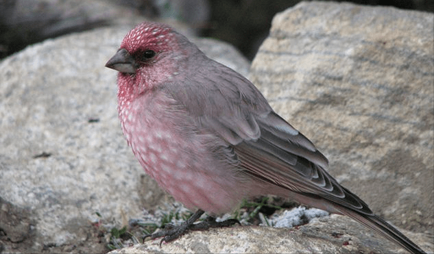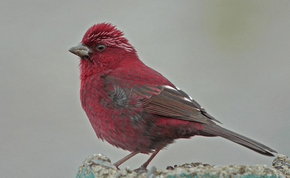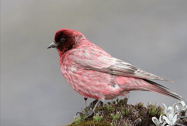 中华白眉朱雀是一种高山小型鸟类,额基、眼先深红色,前额和一条长而宽阔的眉纹珠白色沾有粉红色并具丝娟光泽,在暗色的头部极为醒目。