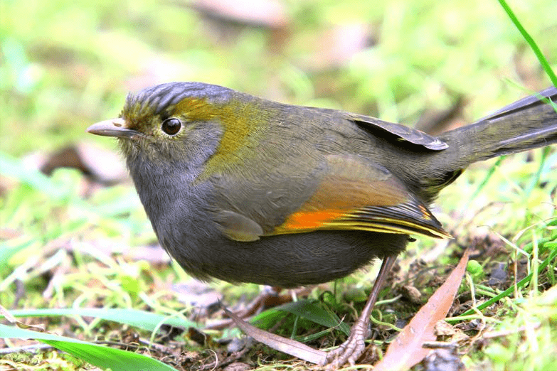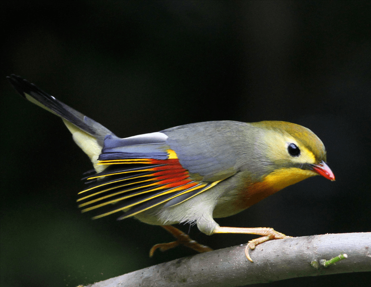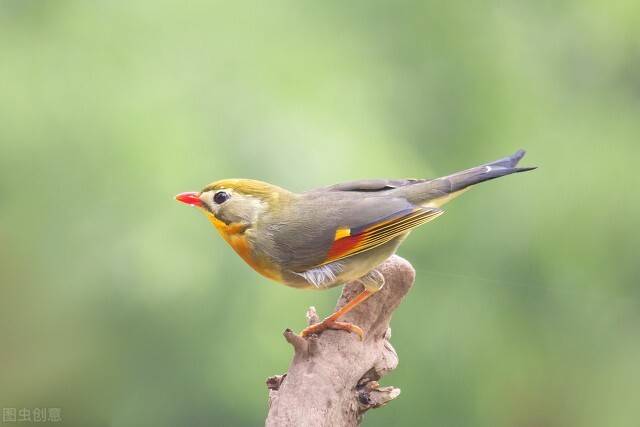 红嘴相思鸟上体从头以至尾上覆羽均为暗灰绿色,头顶绿色较浓;两翅具朱红色翼斑;颏至喉黄色;胸部橙黄;腹部淡白;尾下覆羽浅黄色。