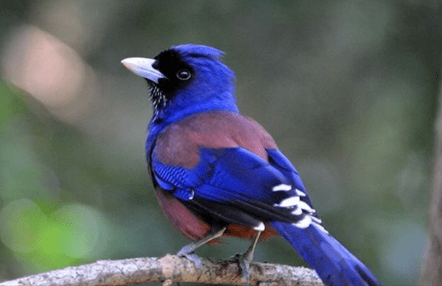 琉球松鸦体长大约38厘米。它的羽毛由深紫红色和蓝色组成,前额具有天鹅绒般的黑色,背部和下体是丰富的板栗色。主要分布在琉球群岛。
