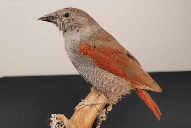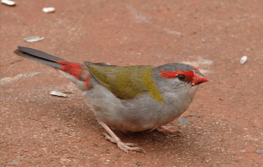红梅花雀雌鸟上体包括两翅覆羽在内概为褐色或赭褐色,飞羽暗褐色,肩、翅上覆羽和内侧飞羽具细小的白色端斑或斑点。尾上覆羽缀朱红色,尾黑褐色,外侧尾羽先端白色。眼先和眼周黑色,头侧灰褐色。颏黄白色,喉、胸和体侧灰色或淡褐沾灰,其余下体淡橘黄色。