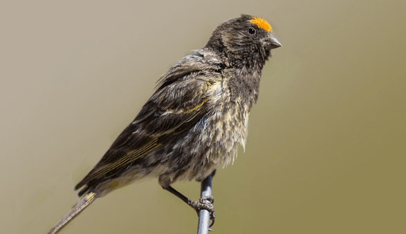 金额丝雀是一种体型较小的褐色斑驳的雀鸟。头近黑,额至顶冠有鲜红色块斑。雄雌同色,体羽在繁殖期更为亮丽。幼鸟似成鸟但头色较淡,额及脸颊暗棕色,顶冠及颈背具深色纵纹。叉形尾,嘴短而呈圆锥形。