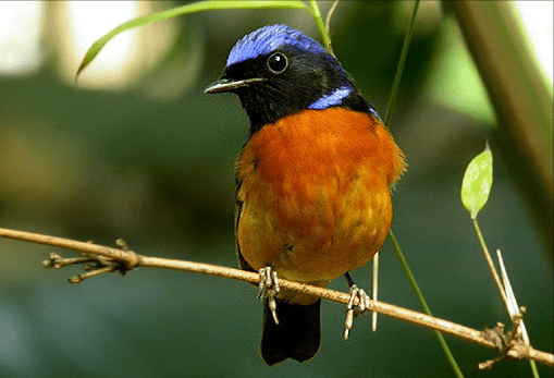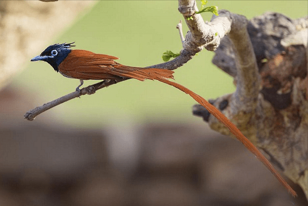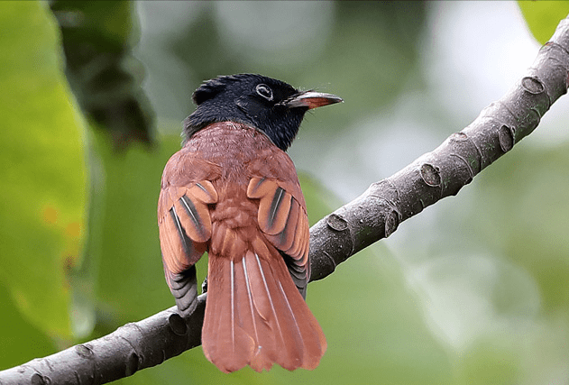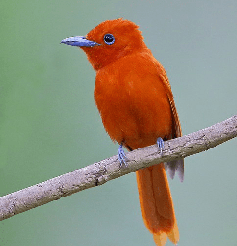 棕红寿带鸟雄鸟体羽棕红色,非常鲜亮。虹膜黑色具蓝色眼圈,鸟喙和脚爪均蓝色。