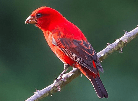 血雀雄鸟除眼先、翼与尾为黑(或淡黑)色外,通体为鲜红色;嘴鲜黄;雌鸟暗橄榄绿色,羽端较淡或带黄色;腰鲜黄;嘴较暗。