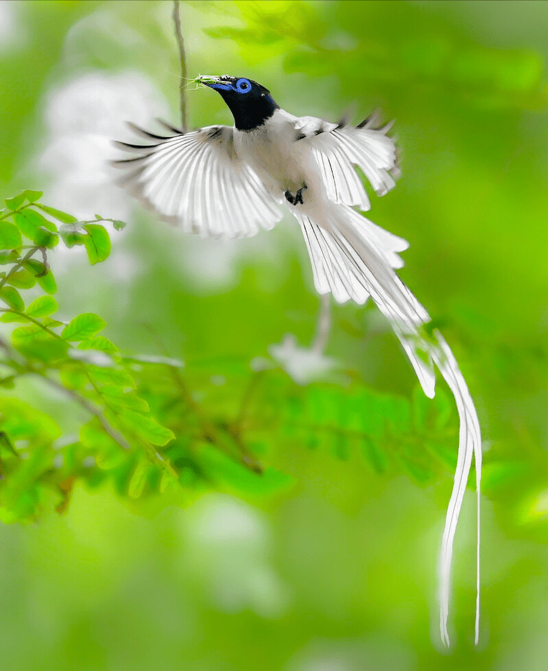 中国绶带有白色型与栗色型,别名:寿带鸟普通亚种、长尾鹟、练鹊、绶带鸟、赭练鹊、一枝花