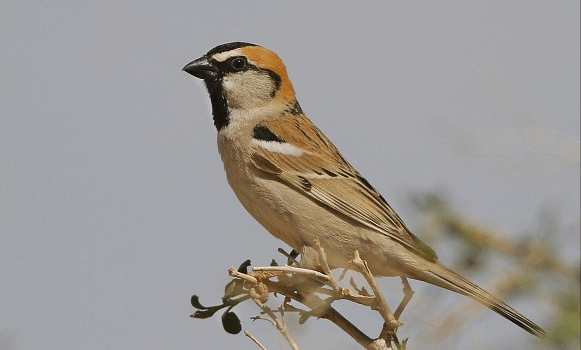 黑顶麻雀雄鸟头顶中央黑色,雌鸟上体淡沙灰褐色,头顶、后颈至上背微具暗色纵纹,眉纹赭红褐色。