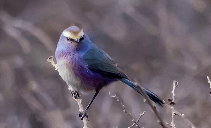 花彩雀莺是一种体型小有毛茸茸偏紫色雀莺。顶冠棕色,眉纹白。与凤头雀莺的区别为眉纹白,无羽冠,顶冠棕色,外侧尾羽有白边。